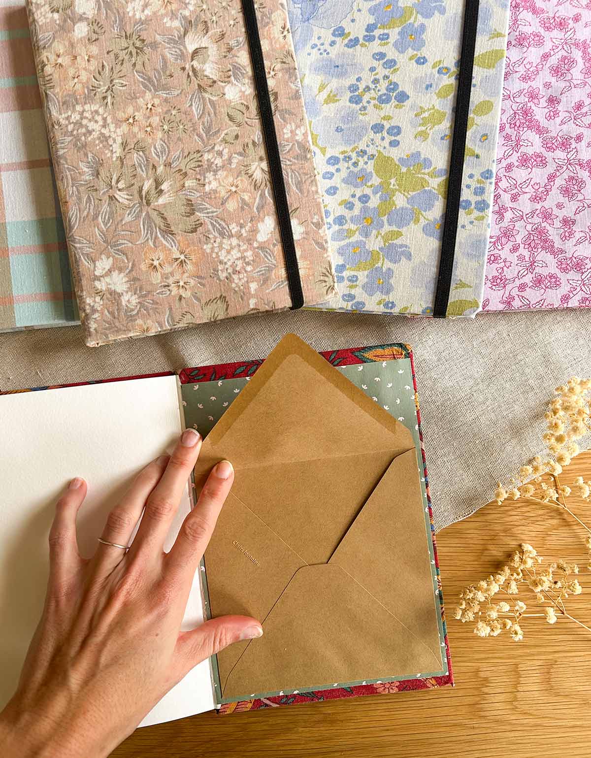 • Petite enveloppe kraft intégrée pour glisser vos souvenirs, tickets, fleurs séchées, mini aquarelles, etc.