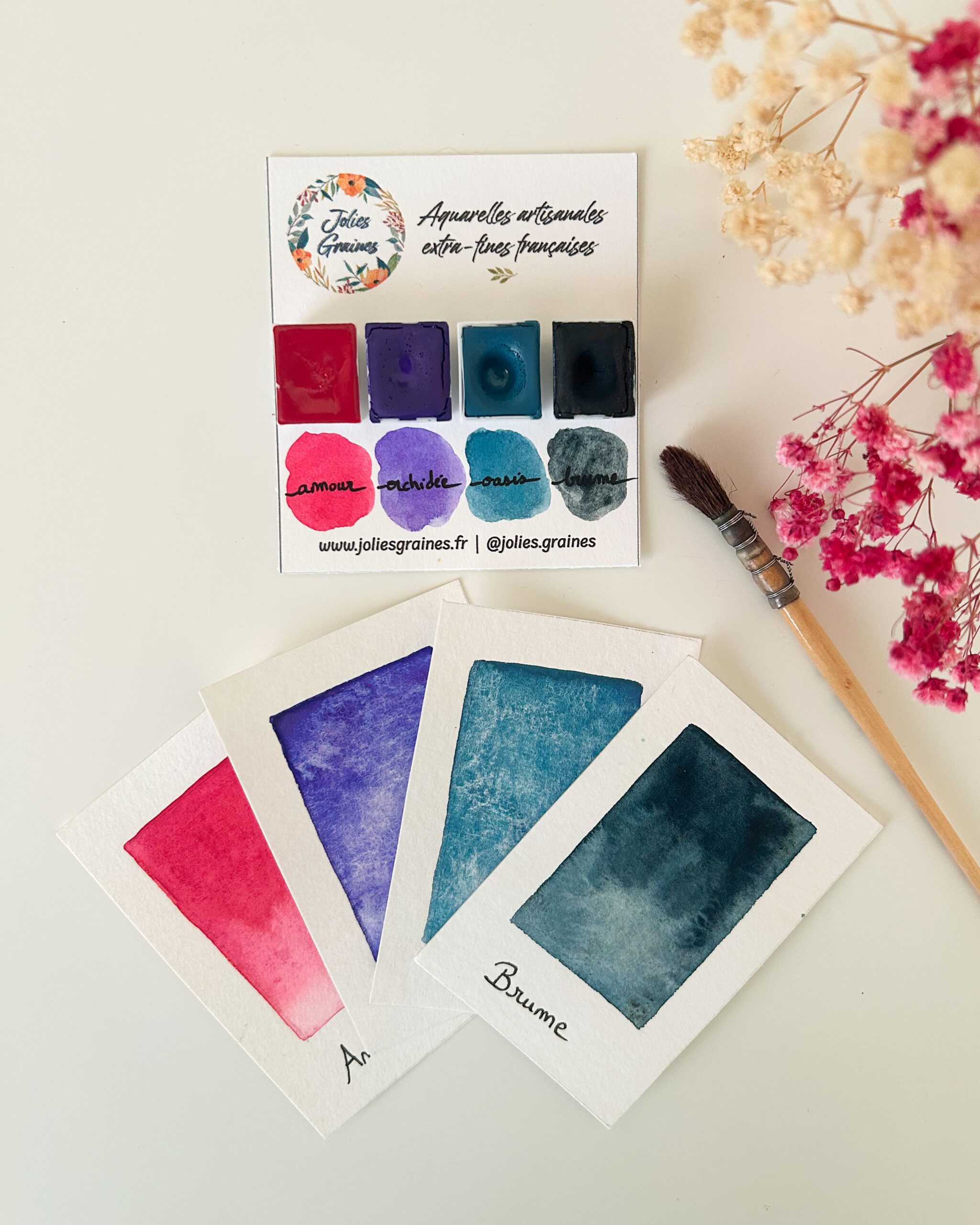 Les aquarelles sont à conserver dans un endroit sec, à l’abri de l’humidité. Les photos des couleurs sont au plus proches de la réalité mais peuvent varier en raison des options d’écran.
