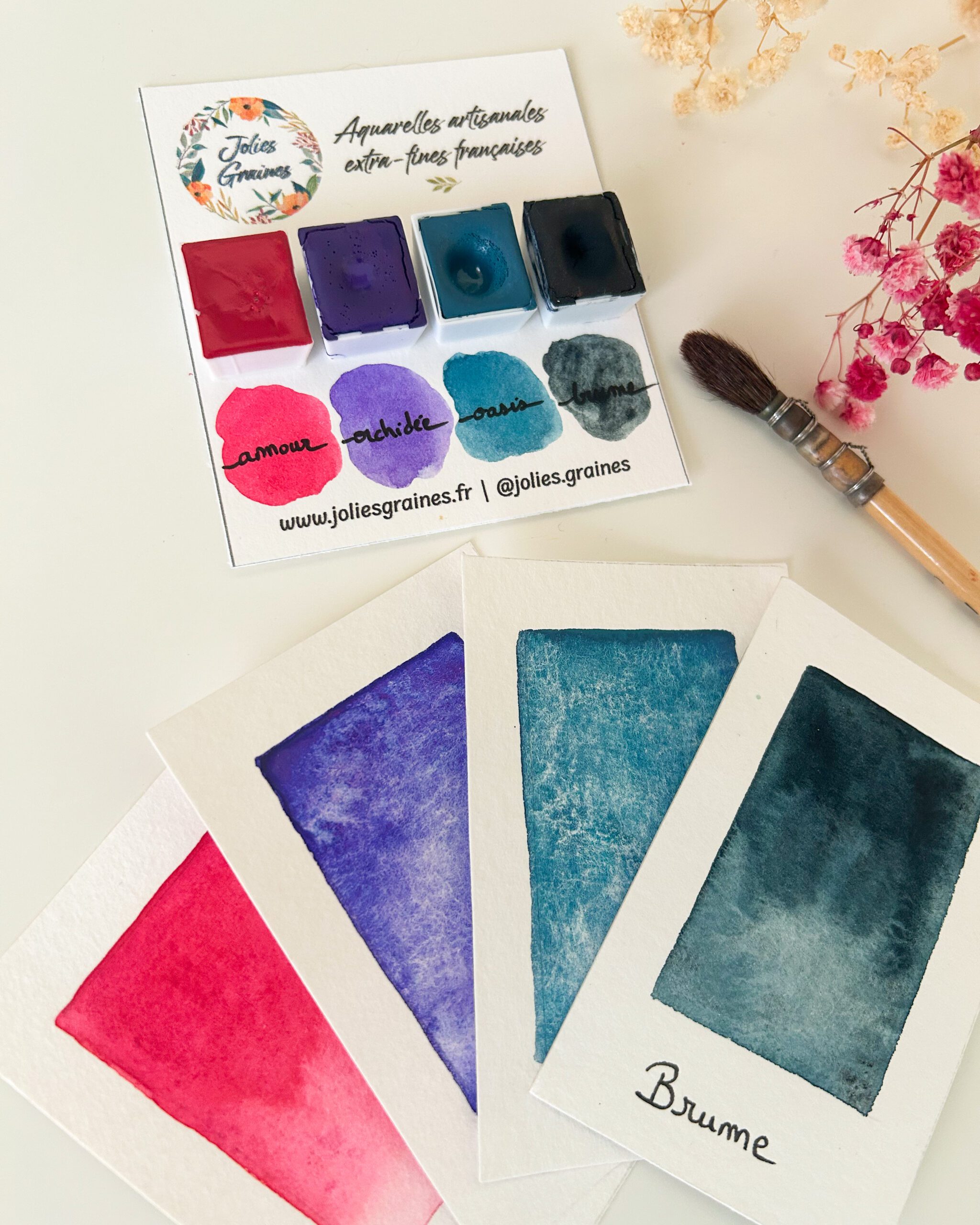 • Aquarelles extra-fines artisanales fabriquées en France avec de la gomme arabique, de la glycérine végétale et une pointe de miel français. Chaque couleur est réalisée à la main, versée et séchée en 3 à 5 fois. Le processus prend 2 à 4 semaines.