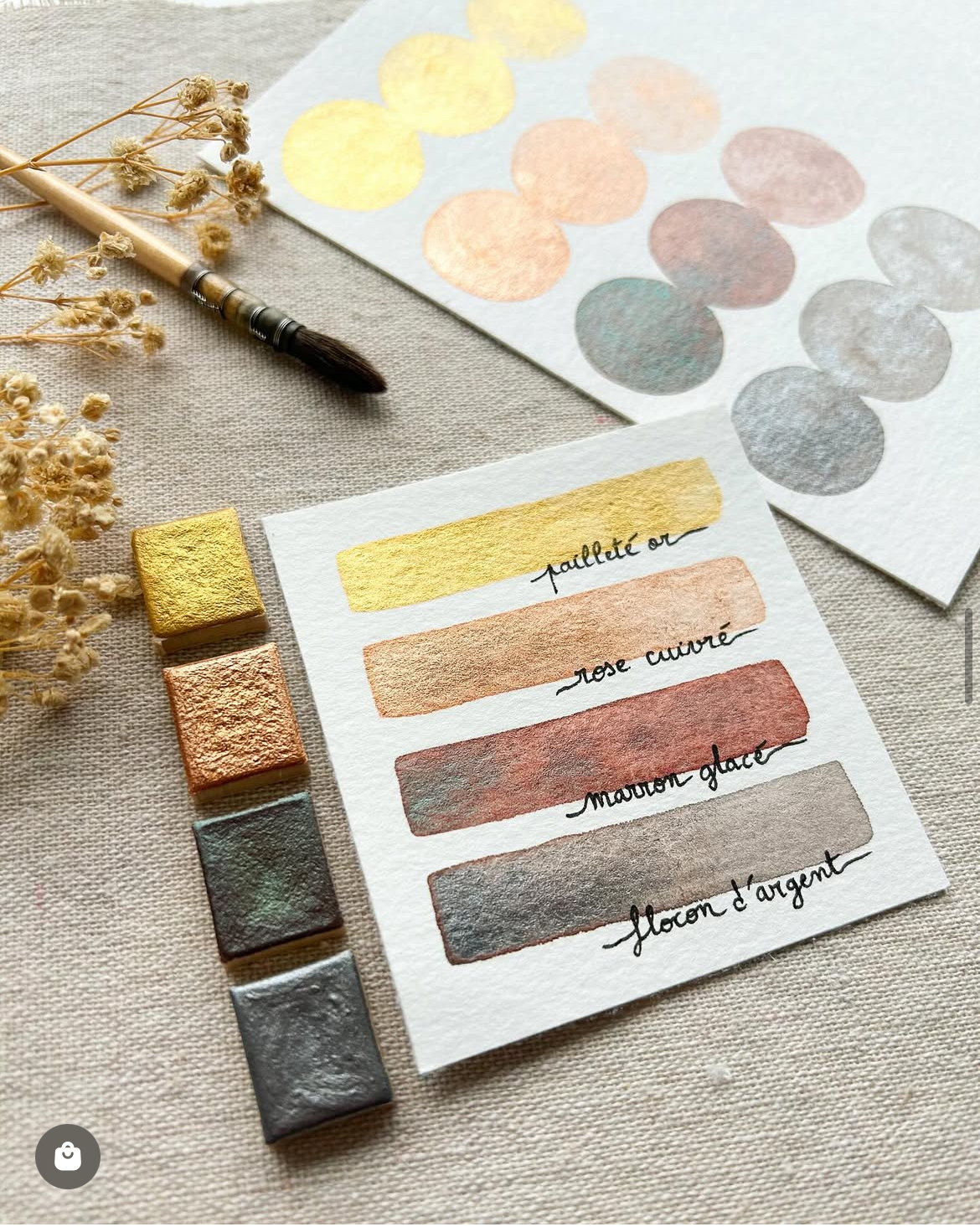 Les aquarelles granuleuses que je vous propose sont duo-chrome, c’est-à-dire qu’en fonction de la quantité d’eau ou d’aquarelle que vous utilisez, vous verrez apparaître deux couleurs avec le séchage. Un effet magique qui saura apporter vivacité et naturel à vos créations !